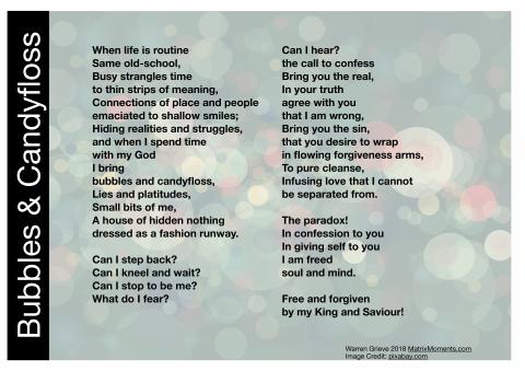 When life is routineSame old-school,Busy strangles timeto thin strips of meaning,Connections of place and peopleemaciated to shallow smiles;Hiding realities and struggles,and when I spend timewith my GodI bringbubbles and candyfloss,Lies and platitudes,Small bits of me,A house of hidden nothingdressed as a fashion runway. Can I step back?Can I kneel and wait?Can I stop to be me?What do I fear? Can I hear?the call to confess Bring you the real,In your truthagree with youthat I am wrong,Bring you the sin,that you desire to wrapin flowing forgiveness arms,To pure cleanse,Infusing love that I cannotbe separated from. The paradox!In confession to youIn giving self to youI am freed soul and mind. Free and forgivenby my King and Saviour!